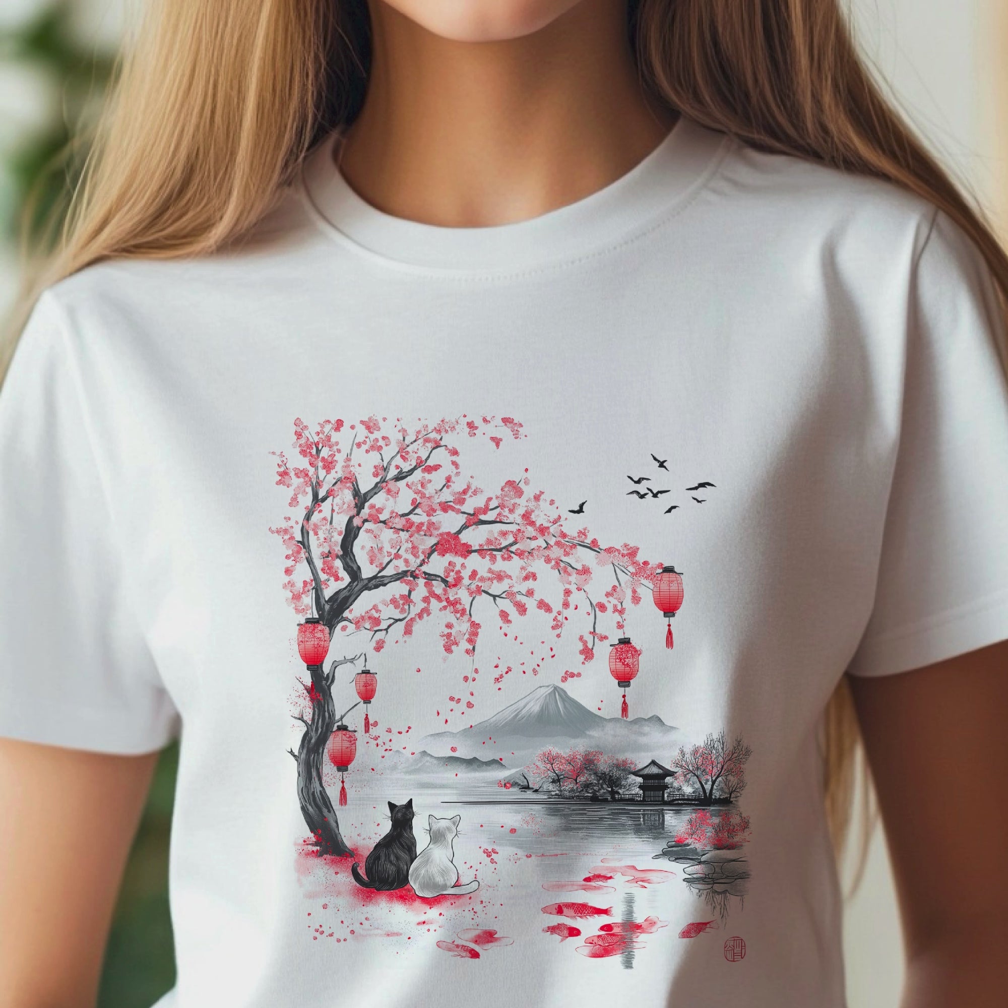 Celebrate your cat love with this stunning Japanese print t-shirt! Featuring elegant Japanese cat designs set against a traditional Japanese landscape, this shirt blends the charm of vintage Japanese art with a modern twist. It’s perfect for cat lovers who appreciate the beauty of Japanese animal art.